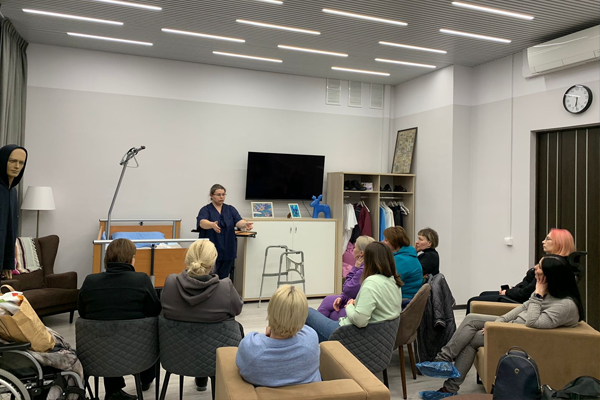 Наш проект «Равный — равному» действует при поддержке ДСЗН г. Москвы, мы обучаем патронажному уходу граждан, проживающих в социальных учреждениях Москвы.